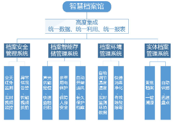 智慧檔案館結(jié)合檔案管理實(shí)際需求,對(duì)電子檔案和實(shí)體檔案進(jìn)行同步管理,高度集成電子檔案管理系統(tǒng)、實(shí)體檔案管理系統(tǒng)、檔案庫房安全管理系統(tǒng)、檔案保管環(huán)境智能管理系統(tǒng)、檔案存儲(chǔ)設(shè)備智能管理系統(tǒng)等幾大系統(tǒng),各系統(tǒng)數(shù)據(jù)相互共享、既獨(dú)立運(yùn)行又互相協(xié)作聯(lián)動(dòng)運(yùn)行,通過智慧檔案管理,實(shí)現(xiàn)統(tǒng)一數(shù)據(jù)、統(tǒng)一利用、統(tǒng)一報(bào)表;實(shí)現(xiàn)智慧檔案感知、協(xié)同處置功能;實(shí)現(xiàn)對(duì)檔案實(shí)體的智能化識(shí)別、定位、跟蹤、監(jiān)控;實(shí)現(xiàn)對(duì)檔案館建筑、智能密集架、恒溫恒濕設(shè)備、空氣凈化設(shè)備、紅外防盜設(shè)備、出入門禁設(shè)備、視頻監(jiān)控設(shè)備等智能化檢測(cè)、評(píng)價(jià)和即時(shí)處理;實(shí)現(xiàn)對(duì)檔案工作者、檔案實(shí)體、檔案建筑設(shè)備及檔案利用者之間的全面感知,起到優(yōu)化資源配置的作用,使實(shí)體檔案的價(jià)值得以被最大化開發(fā)利用。既滿足各級(jí)檔案館對(duì)電子檔案的業(yè)務(wù)管理需要,也滿足各級(jí)檔案館對(duì)實(shí)體檔案的業(yè)務(wù)管理需求。使檔案新資源的系統(tǒng)利用狀況及檔案管理系統(tǒng)功能可以滿足新形勢(shì)下檔案工作的應(yīng)用需要,推動(dòng)檔案工作水平再上新臺(tái)階,全面支撐和服務(wù)企業(yè)發(fā)展。